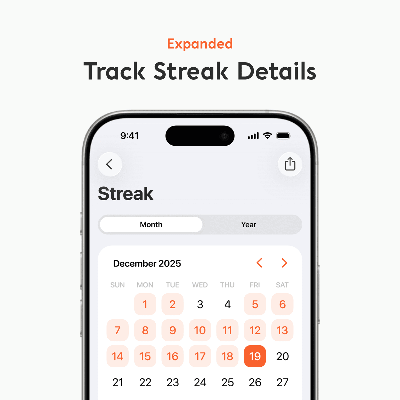 Speaking of streaks, there's a new detail view to track your logging habits over time. Get a visualization of which days you logged by month or by year. If you're familiar with GitHub's contribution visualization, you'll definitely want to check out the year view for a similar chart.
