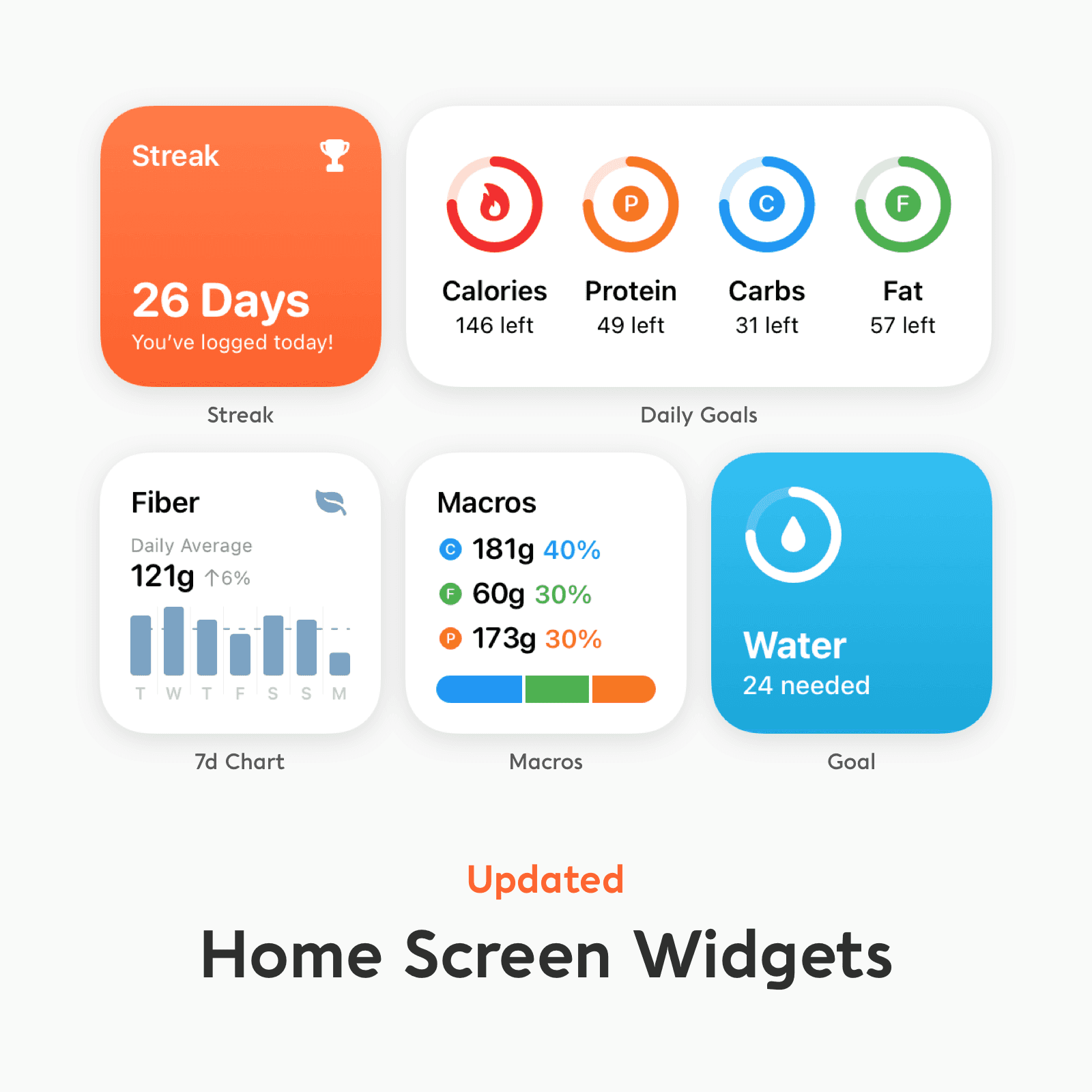 We wanted to refresh the widgets to reflect the new Foodnoms look and feel, as well as introduce several top-requested features from over the years: 7-day charts, macros, and a streak widget that shows your current logging streak.