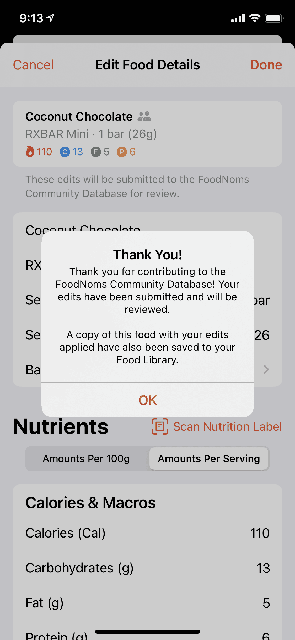 The "Thank You!" modal also teaches you that when you make a correction, that correction is saved to your library so next time you scan that food item, it will use your correction even before it is moderated/accepted.